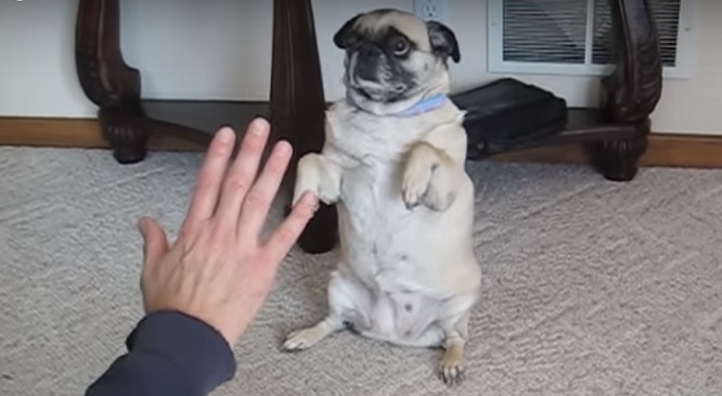 Pugs are smart dogs and can be trained to do just about anything – for food of course!