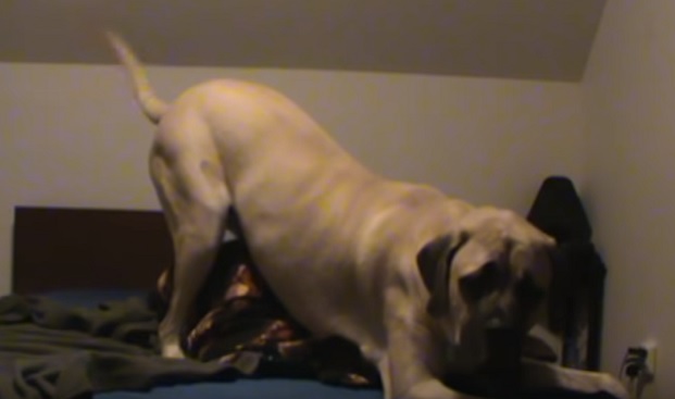 Lincoln the Mastiff doing everything he can to NOT have to get off the bed.