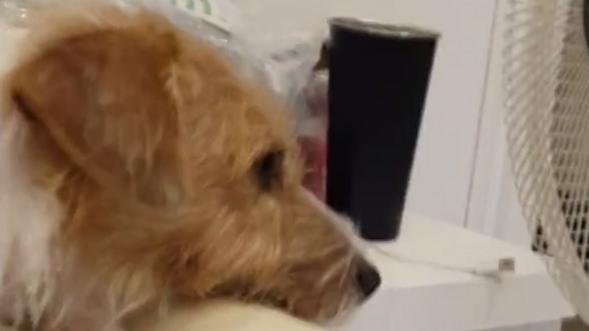 Watch him place himself right in front of the cool breeze from the fan.