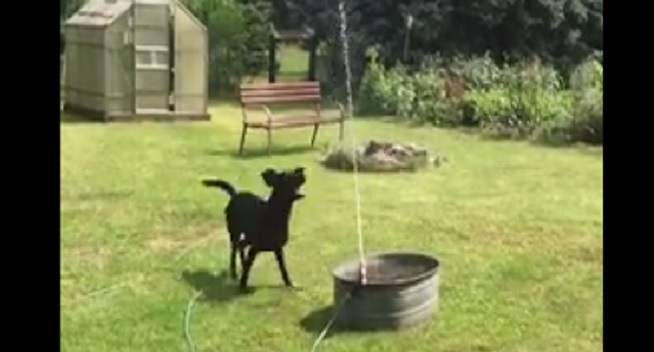 This Labrador knows that the funnest way to keep cool this summer is to play with the sprinkler!