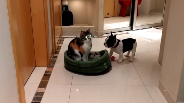 It seemed as if poor Pixel would have to spend the rest of eternity sleeping helplessly next to the his former bed while the cat laughs at him.