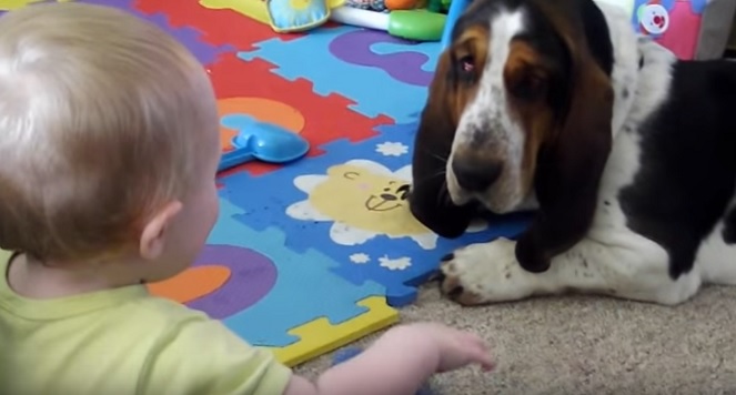 This has to be the most patient Basset hound in the world! Watch how Fred very gently plays with this little baby, Bradley.