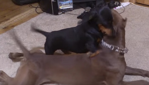 While some Pit Bulls have a bad reputation, this pair of Pitties is all fun and games as they play and wrestle with their friend, a black and brown Dachshund.