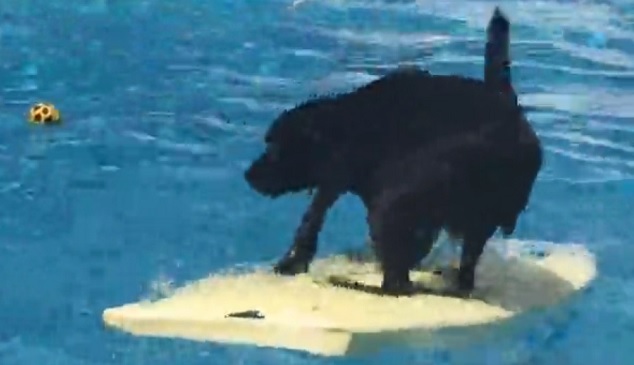 The only time she moves is when the owners throw in her favorite ball, and even then, she stays on the board and manages to move it to the all by paddling with her paws and even her tail to make the board go in the direction of the floating ball.