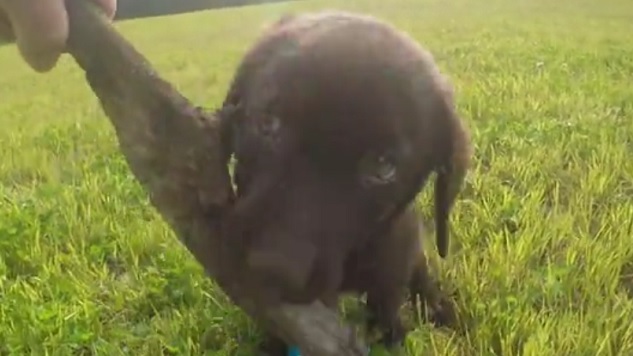 Puppies love to run and play, and this cute little chocolate Labrador puppy has a great big green meadow to do it in.