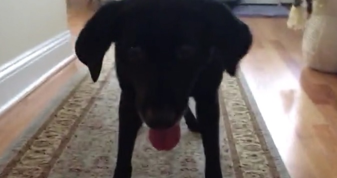 Wow, what a good invention! It appears to hold small tennis balls and this black Labrador pup seems to be really excited about the chance to grab that ball.