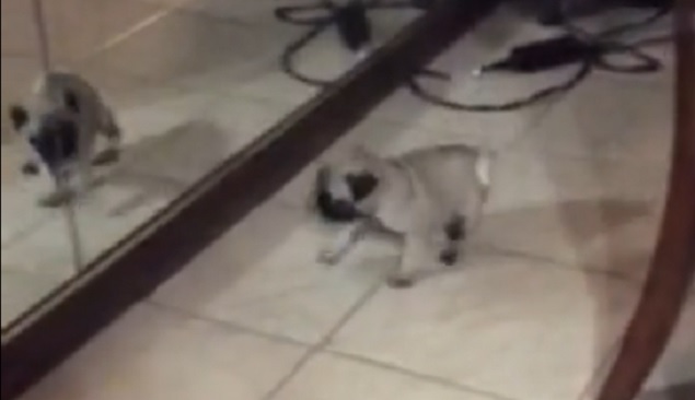 Dogs just love to play and whether or not this little pug is actually fooled by the reflection and thinks it is another dog or if he merely likes running back and forth and seeing himself in the mirror, we may never know.