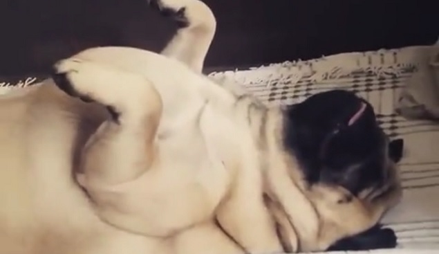This chubby little pug must really have been super tired, because he is in a crazy and awkward sleeping positon on the bed.