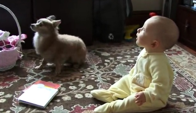 I don’t know if the dog is trying to save his baby friend from the bubbles or is just trying to catch them, but it is sure funny as he races around the room and the baby.