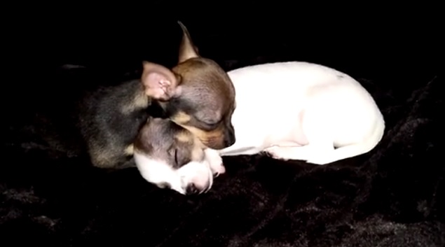 Dogs love to cuddle and snuggle with each other and these two little Chihuahuas look very sweet together.