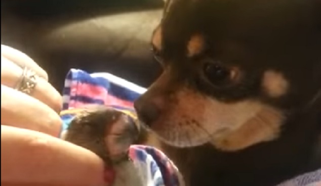 At the same time, Wiskey the Chihuahua licks and nudges the parrot with his nose.