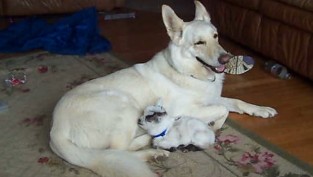 When her owner brought an infant goat home, she took in the baby goat as one of her kind.