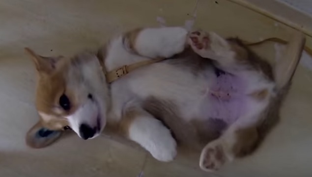 The little dog is laying under a table in part of the video and is all splayed out with his four feet pointing in all directions and his cute fluffy belly exposed to the world.