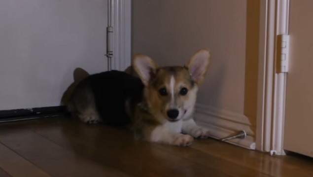Dogs get curious about a lot of things, and this cute fluffy Corgi pup seems obsessed by a doorstop.