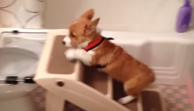 We see the final results of the training as the little dog climbs up some stairs placed beside the toilet and then turns around and squats to pee.