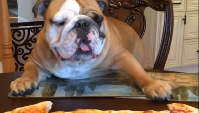 Everyone loves pizza, and this English Bulldog is having a pizza party!