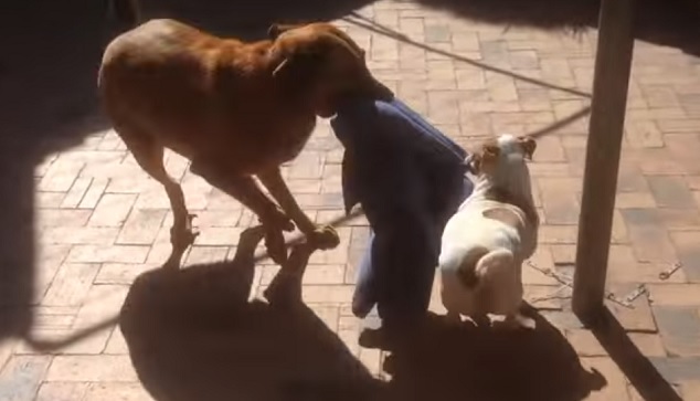 The Jack Russell endlessly never gave up even when being pulled around by the Ridgeback dog.