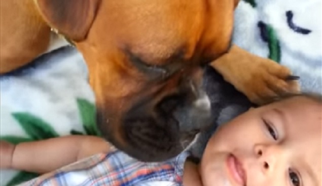 The above video explain how protective and caring the female boxer dog is: As it shadows a handsome baby from trespassers, continually kissing the baby, by constant dedication and attention to the pleasure and satisfaction of the baby. Quite an amazing babysitter.