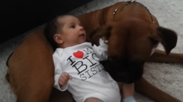 In this video, Nikki the Boxer is seen relaxing and allowing baby Kai to use her as a pillow.