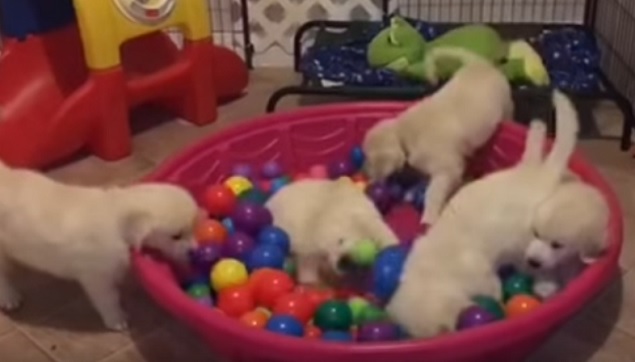Balls are a dog’s best friend, and these five Golden Retriever puppies are having a blast in a pool filled with colorful plastic balls that has been put into their enclosure.