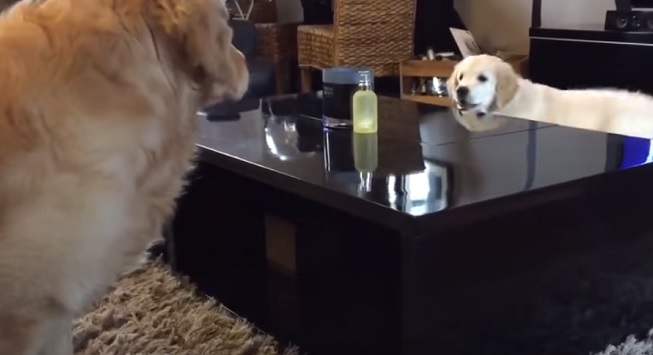These two Golden Retrievers are having fun chasing each other round and round the coffee table.