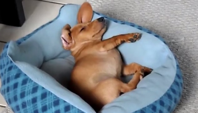 That’s what this little miniature dachshund is thinking when his owner tries to get him to get out of her bed to go outside.