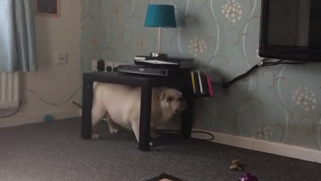 In this care, this pudgy bulldog pup somehow and for some reason goes under a tiny table covered in books, a lamp and more.