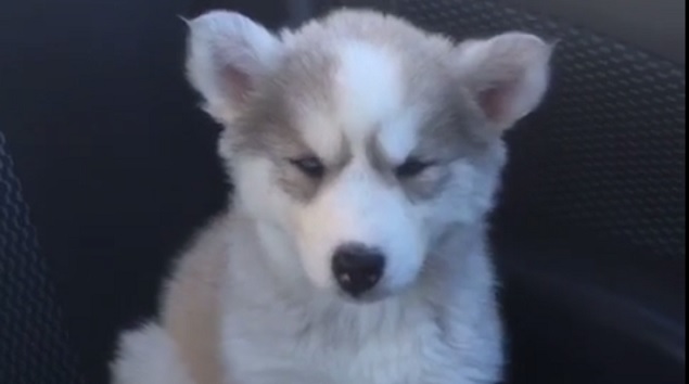 In this video clip, Justin the husky puppy dog joins the family for a ride to the grocery store.